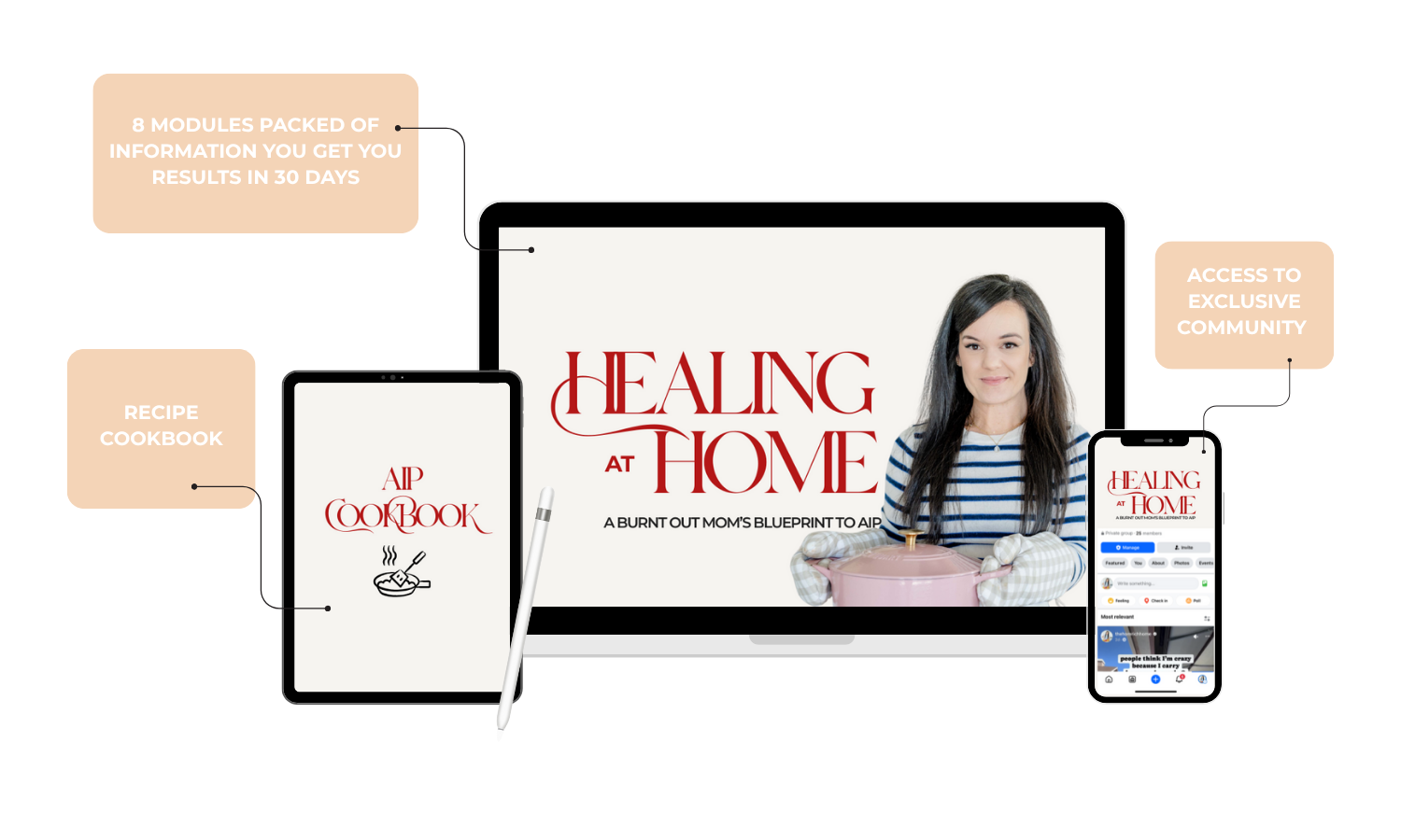 If you’re waking up already tired, staring at the fridge with no idea what foods will serve your body, and relying on coffee just to get through the day, you’re not alone. Maybe dinner feels like a daily battle, trying to pull together something “healthy” while the kids are melting down and you’re too exhausted to think straight. You want to feel better, but you also need something realistic, because you’re still running a home, packing lunches, and doing all the things. Healing at Home is your step-by-step mini course that uses the Autoimmune Protocol (AIP) in a way that actually works for your life as a busy mom. In just 30 days (or less!), you can expect to: wake up with more energy, have simple, healing meals ready to go, and feel present and patient with your kids again. You’ll learn exactly how to reduce inflammation, support your body’s healing, and still keep family meals on the table, without cooking three different dinners or spending all day in the kitchen. This is your shortcut to feeling like yourself again, without the overwhelm or magic pills. This is real, root cause healing.